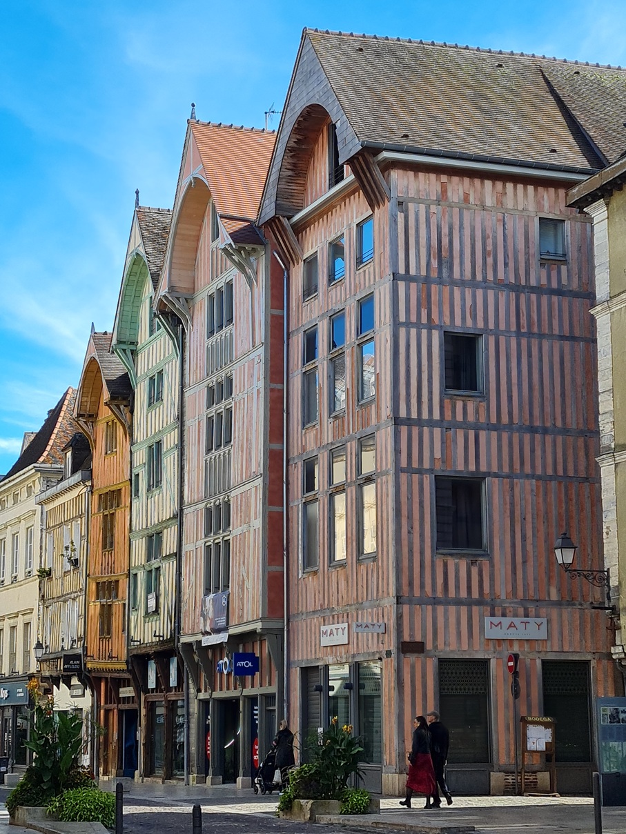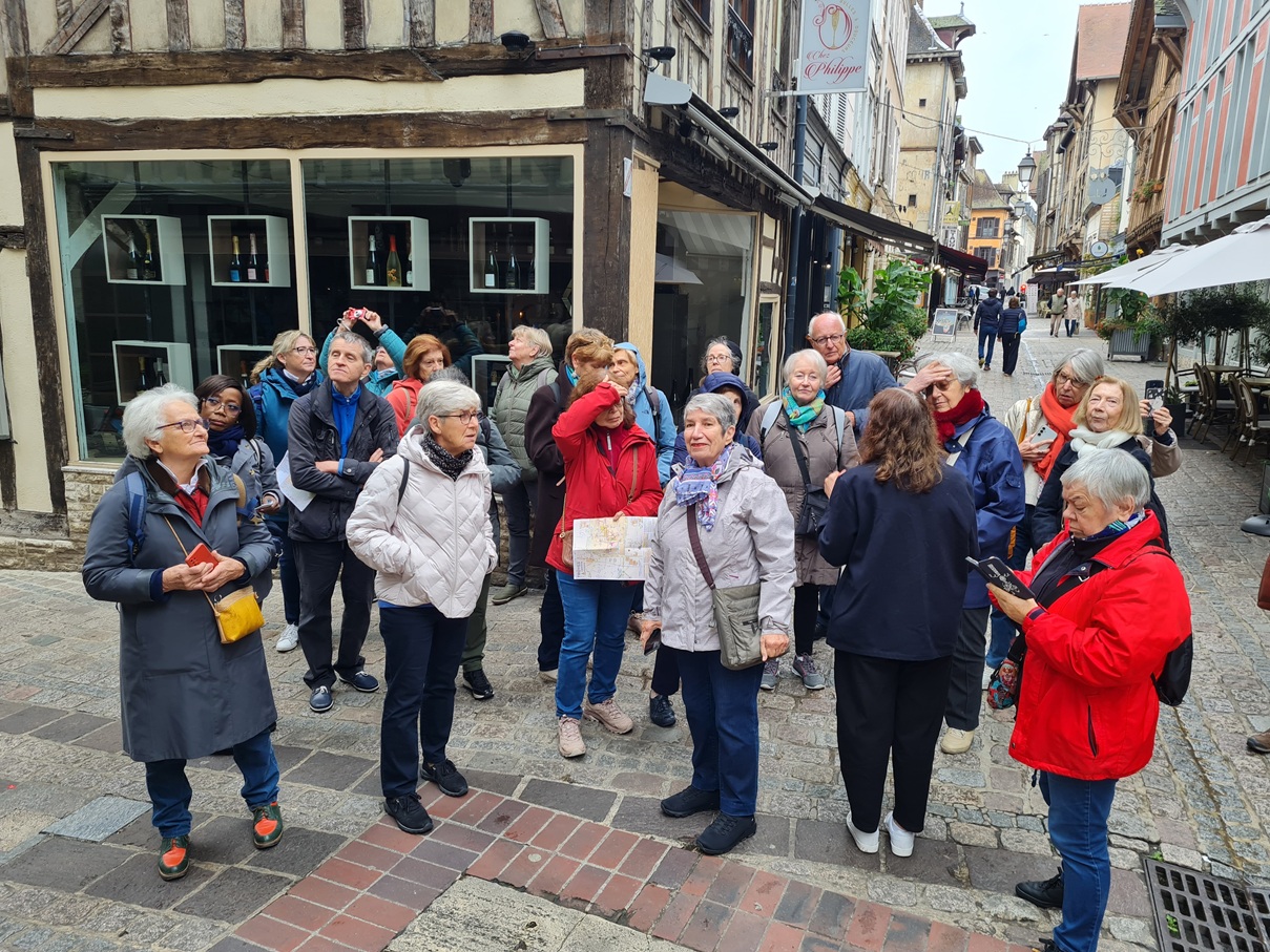 Il faisait gris et un peu frais lors de notre arrivée à Troyes, vers 10h15. Nous étions attendus pour une visite guidée du centre historique de la ville. Deux groupes de 23 personnes se sont formés, chacun suivant une guide-conférencière agréable et compétente. Beaucoup parmi nous ne connaissaient pas cette ville, ils out été stupéfaits devant cette remarquable quantité de maisons anciennes bien restaurées ; et ils furent étonnés dans l’église Ste Madeleine, en admirant son extraordinaire jubé (une dentelle de pierre) et les remarquables vitraux.